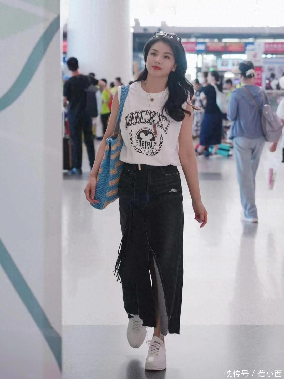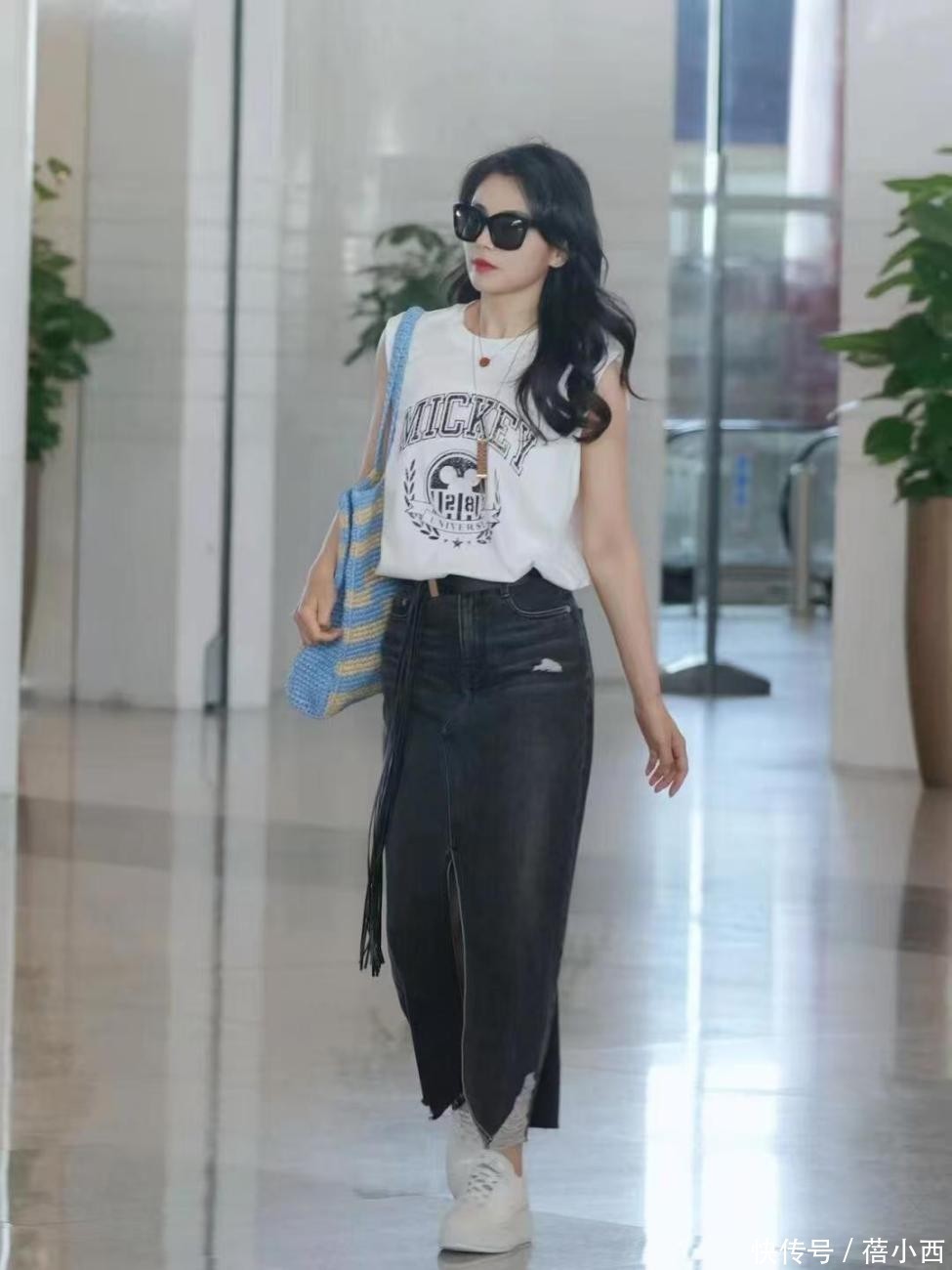下半身搭配一条高腰的牛仔半身裙,能直接拉高腰线,打造“胸以下全是腿”的比例,显高效果拉满。而且半身裙的做旧黑牛仔面料自带复古质感,能悄悄遮住腿上的肉肉。前侧开叉设计更是点睛之笔,增加了造型的灵动感,又能拉长腿型,长度到脚踝附近,日常通勤、出行都适配。刘涛并没有搭配高跟鞋,而是搭配了一双小白鞋,鞋子的厚底设计可以悄悄增高,优化身材比例,顺便还中和了牛仔裙的厚重。