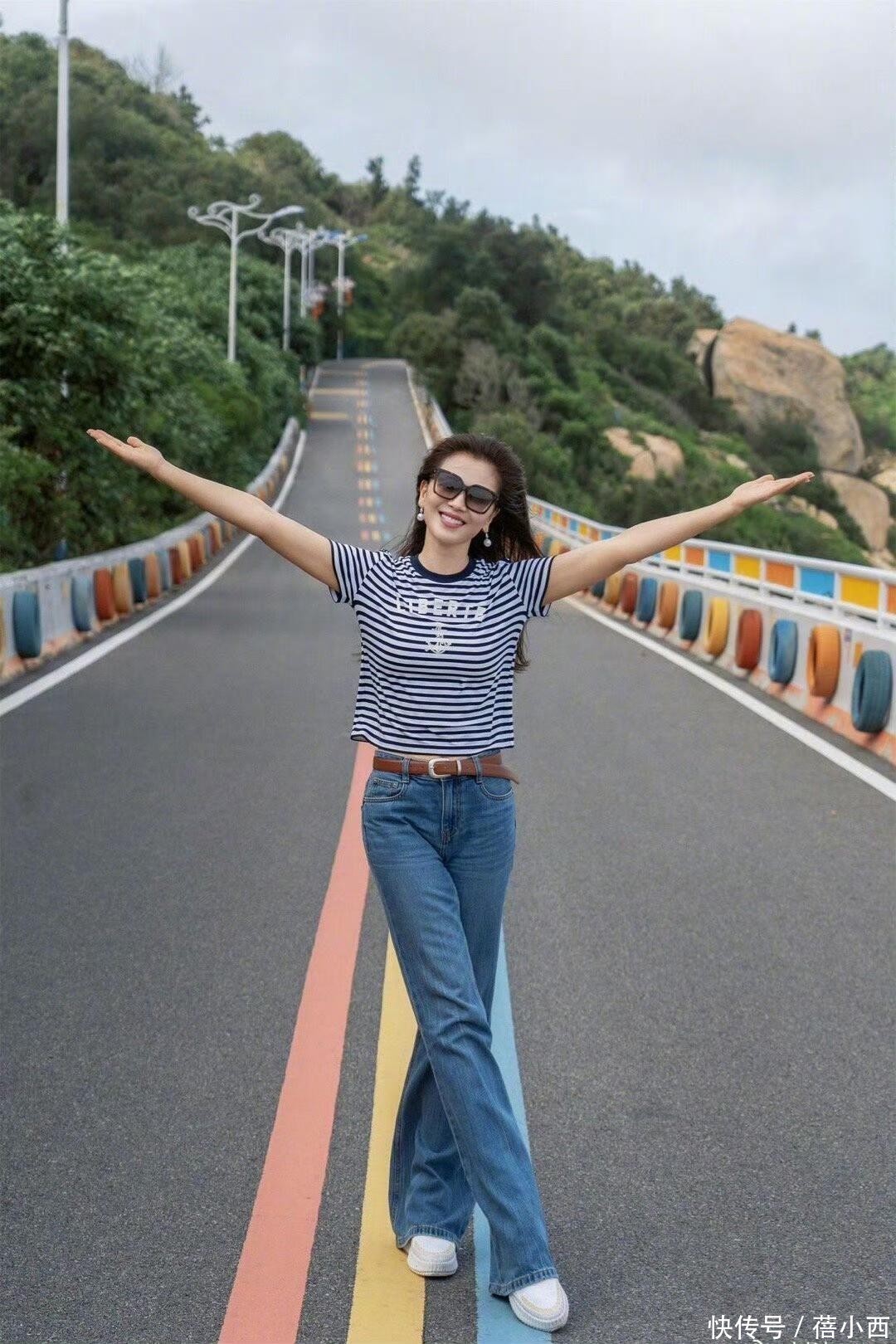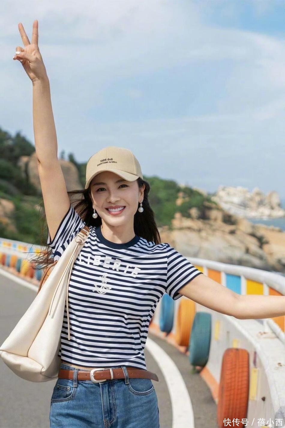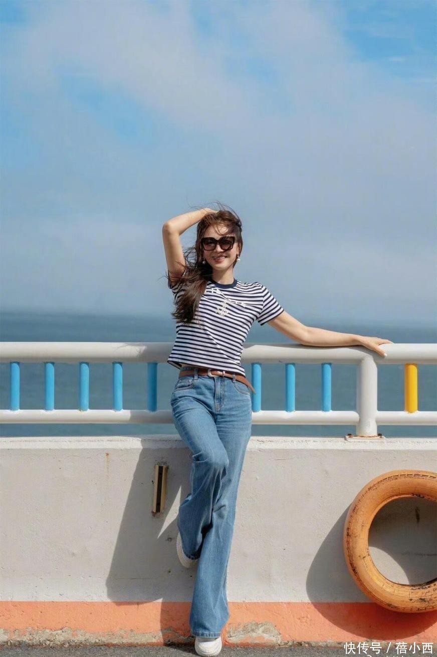 刘涛的这一套海边造型真的绝了,完全是夏日度假的搭配模板,她上半身穿的是一件基础款蓝白条纹海魂衫,谁穿谁清爽,经典的条纹元素自带减龄效果,一点都不显老气。版型是修身款,刚好贴合身形,不会松松垮垮,还能悄悄勾勒身材线条,露出纤细的腰肢,显瘦又利落。